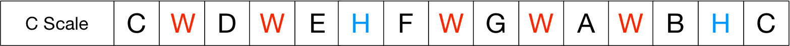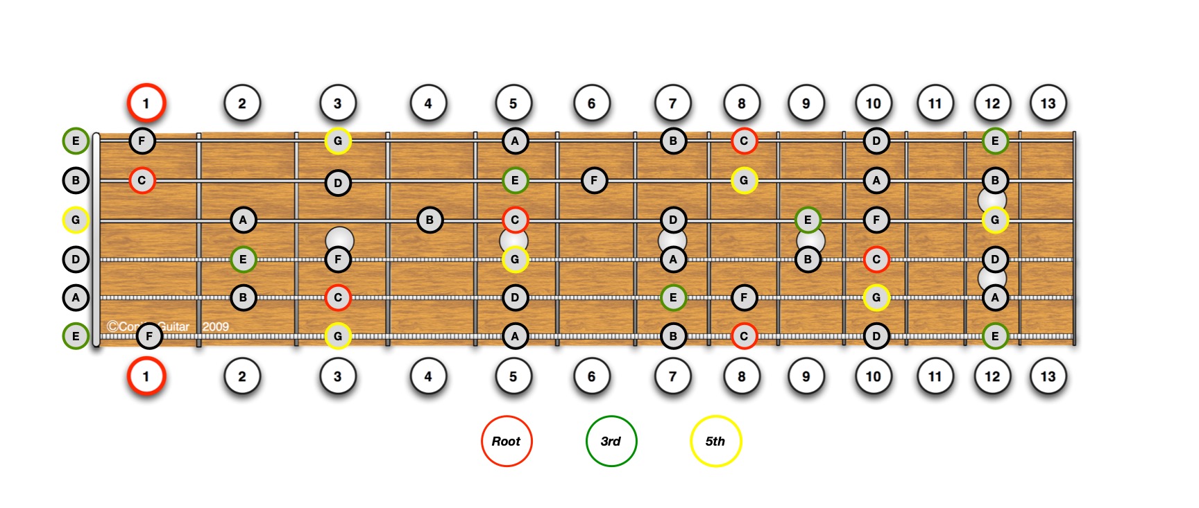 The following example shows notes of the C Major scale on the guitar fretboard for the first 12 frets.